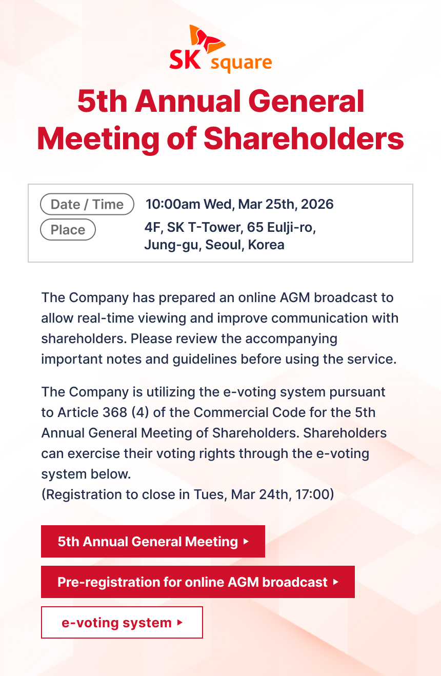 The Company is utilizing the e-voting system pursuant to Article 368 (4) of the Commercial Code for the 5th Annual General Meeting of Shareholders. Shareholders can exercise their voting rights through the e-voting system below.(Registration to close in Tues, Mar 24th, 17:00)